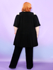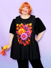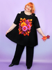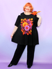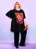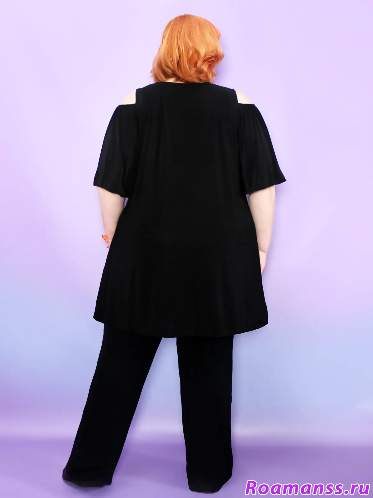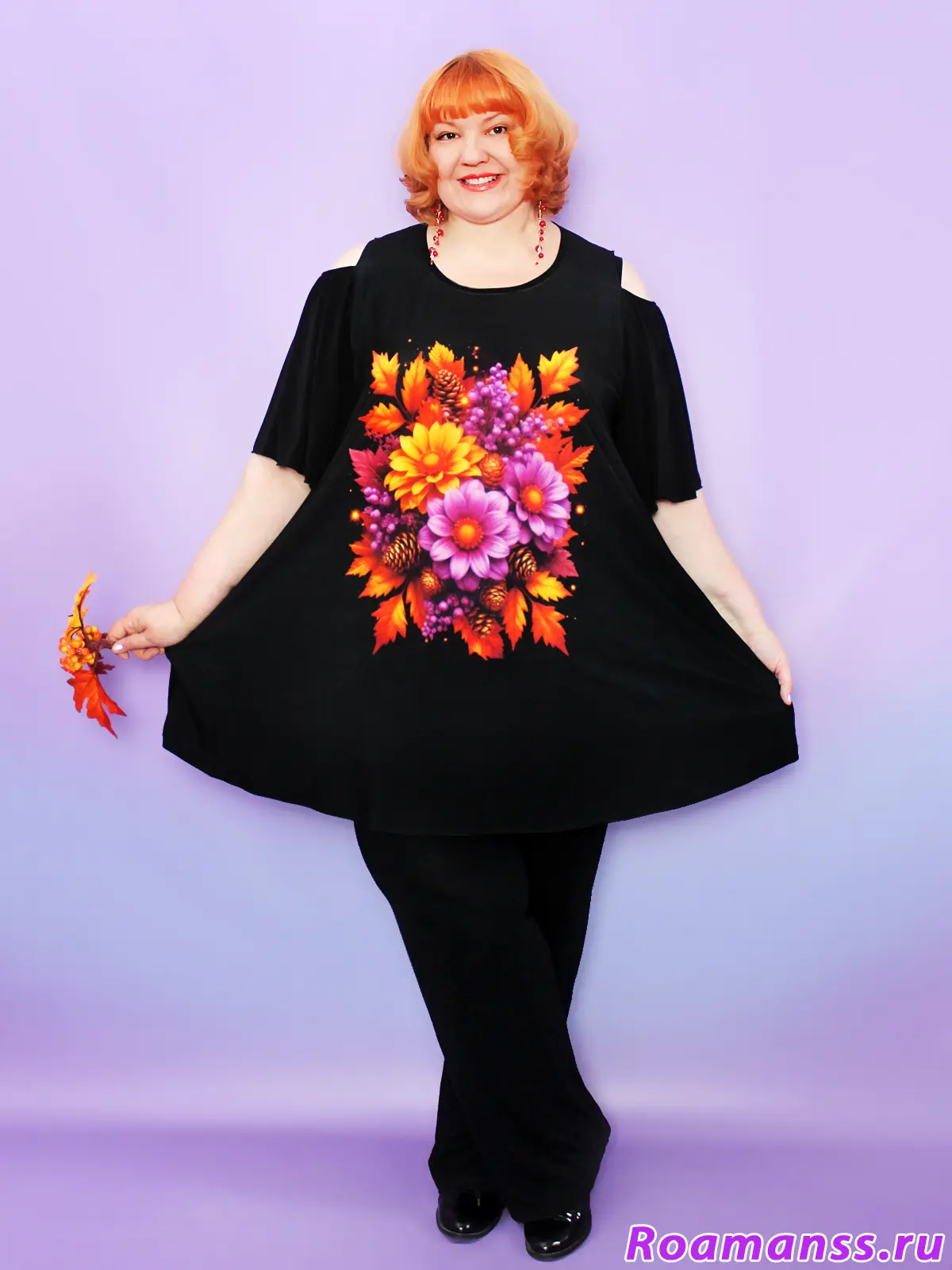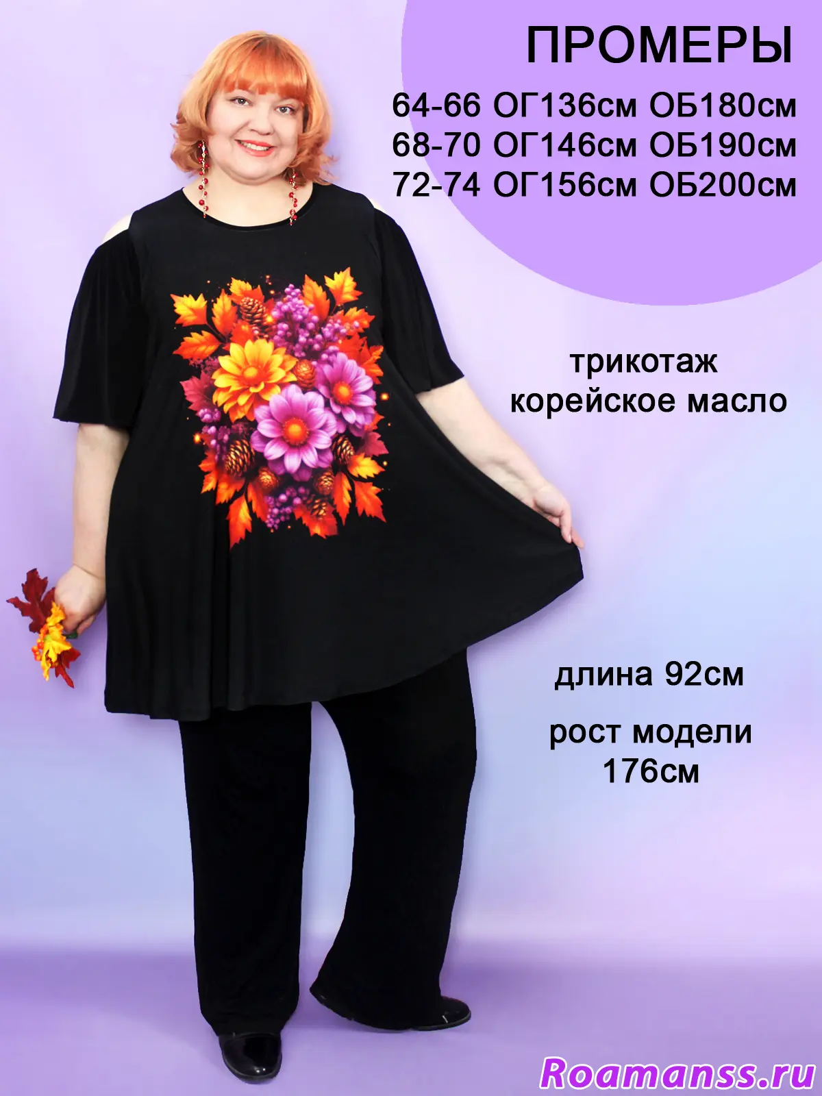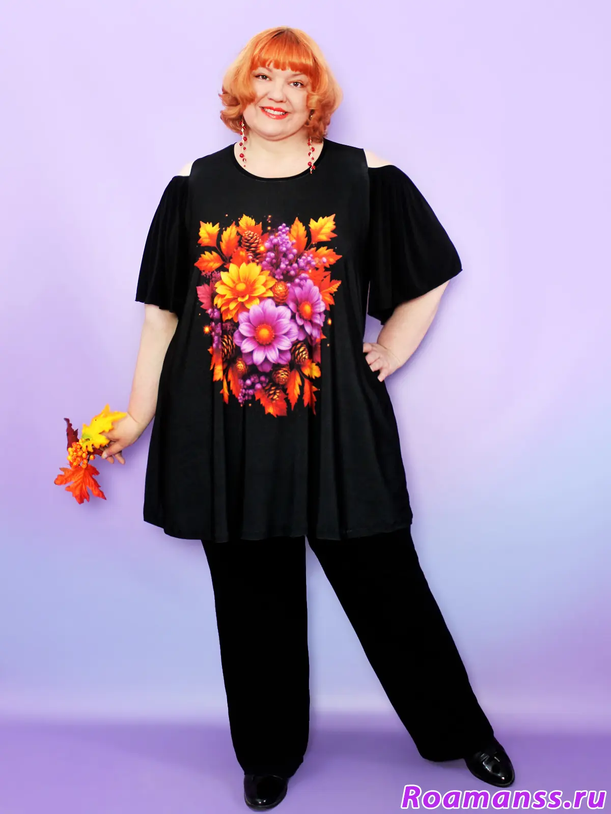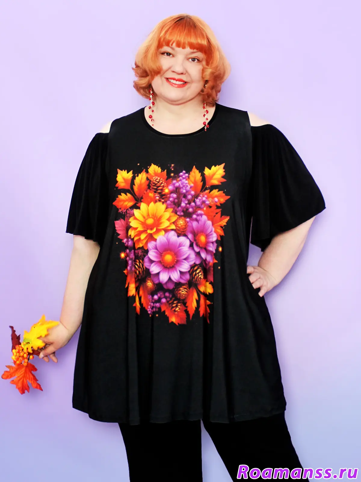 Стильная дизайнерская туника больших размеров для полных женщин. Эта женственная туника выполнена из трикотажа корейское масло. Она идеально садится по фигуре благодаря трапециевидному расклешенному крою. Чёрная основа c ярким авторским принтом визуально стройнит, а рукава-крылышки придают образу легкость и романтичность. Туника комфортна для повседневной носки и создаёт нарядный образ для любого случая - работы, отдыха или встречи с друзьями. Материал приятен к телу, хорошо тянется и красиво струится при движении. Выбирайте красоту и комфорт каждый день!