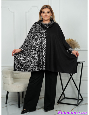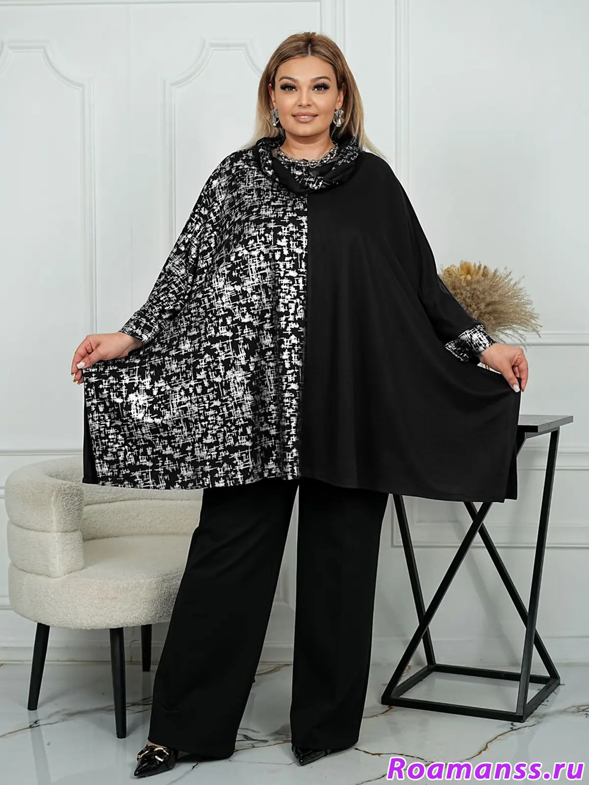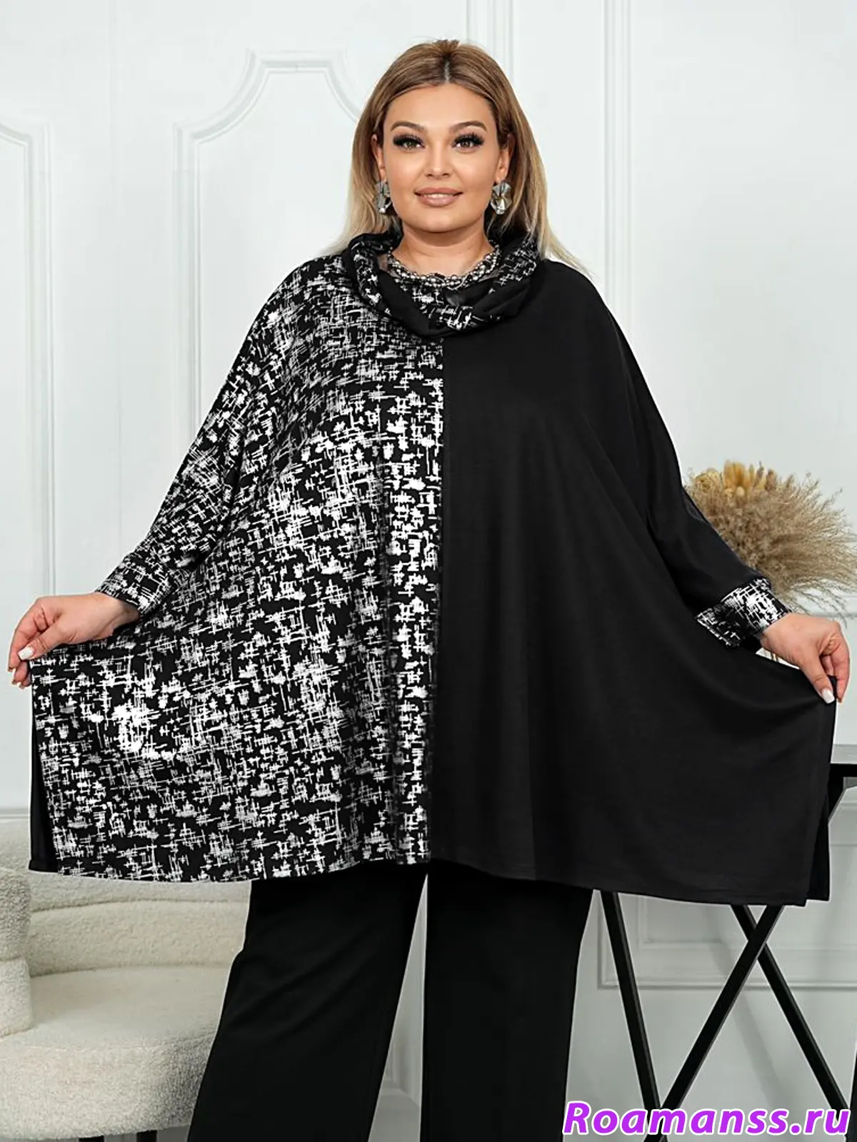 Эффектная туника размахайка. Украшена серебристым принтом. Фасон расклешен. Вырез горловины задрапирован воротником типа хомут. А-силуэт туники отлично маскирует проблемные зоны в районе живота и бёдер. Туника отлично подойдёт для праздника. Ткань канада. Длина около 90см.