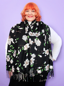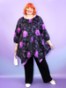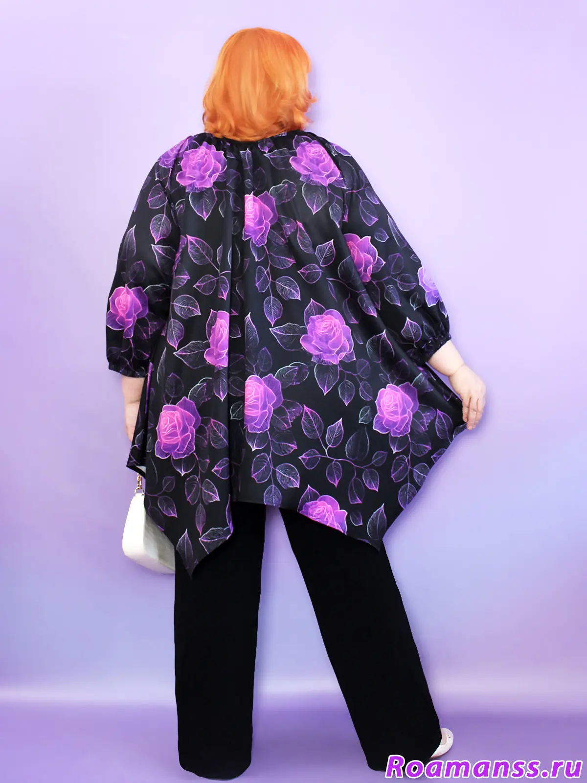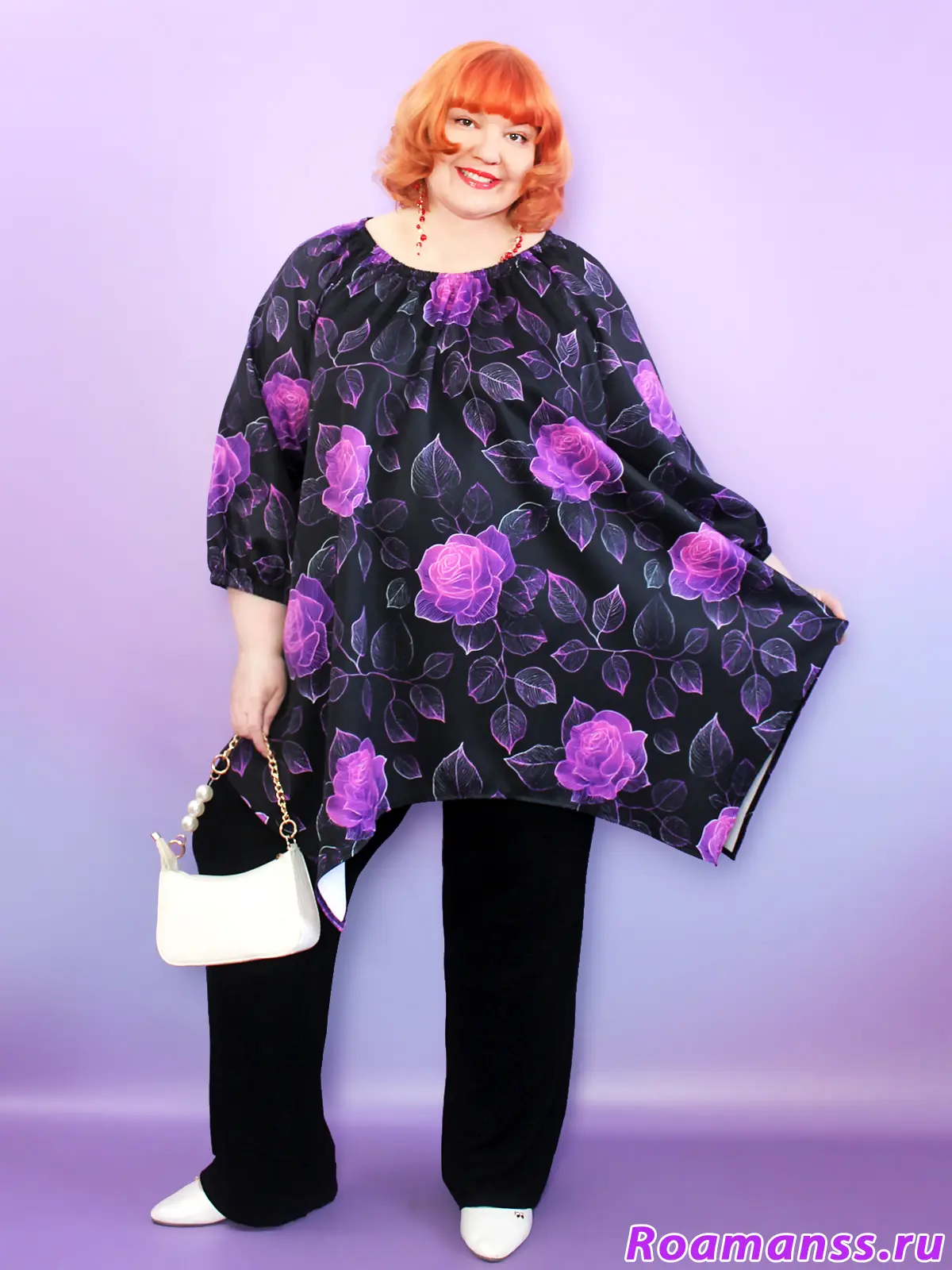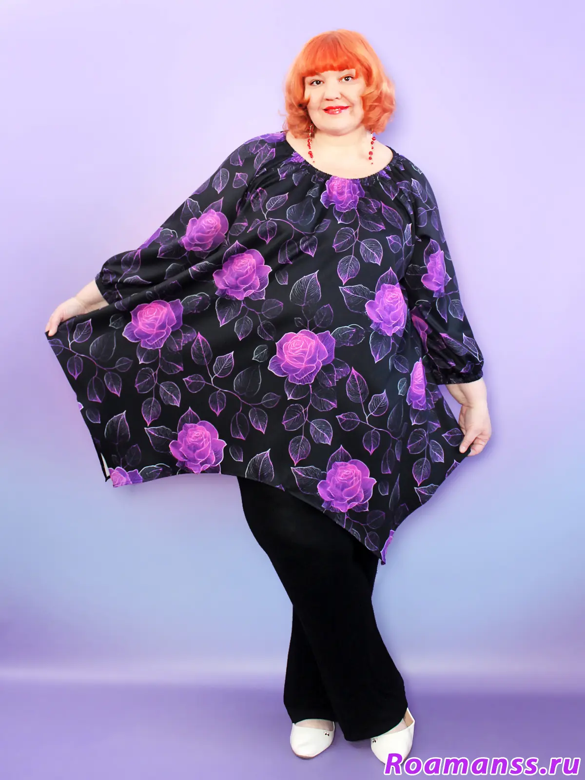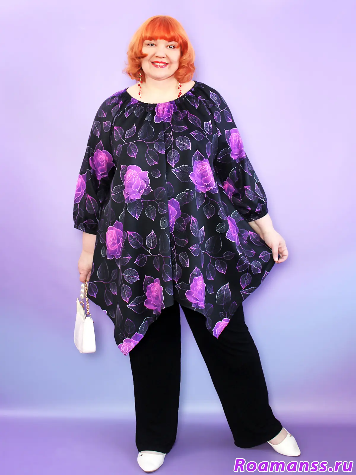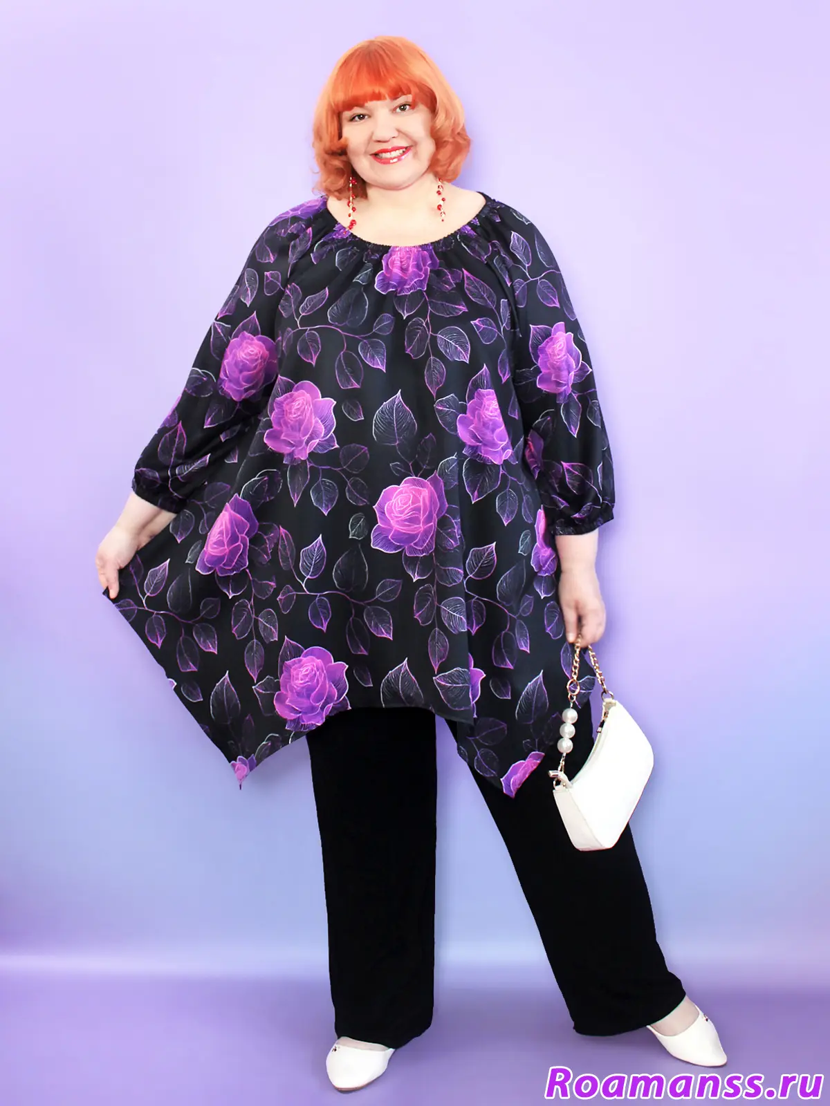 Эта нарядная туника больших размеров станет изюминкой вашего гардероба. Плотная и гладкая ткань Барби с ярким цветочным принтом приятно лежит на фигуре и отлично держит форму. Свободный сильно расклешённый фасон с эластичной горловиной и рукавами прекрасно подходит для полных женщин, скрывая недостатки и создавая женственный, стильный образ. А рукава формы реглан длиною три четверти, создают дополнительный комфорт и подходят на любую длину рук. Идеально для праздников и повседневных выходов! Длина от плеча 95-105см.