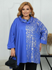 Эффектная туника размахайка. Украшена серебристым принтом. Фасон расклешен. Вырез горловины задрапирован воротником типа хомут. А-силуэт туники отлично маскирует проблемные зоны в районе живота и бёдер. Туника отлично подойдёт для праздника. Ткань канада. Длина около 90см.