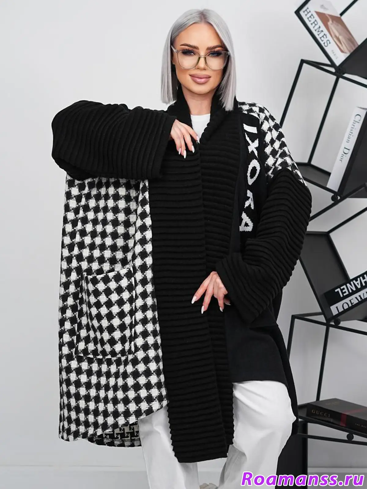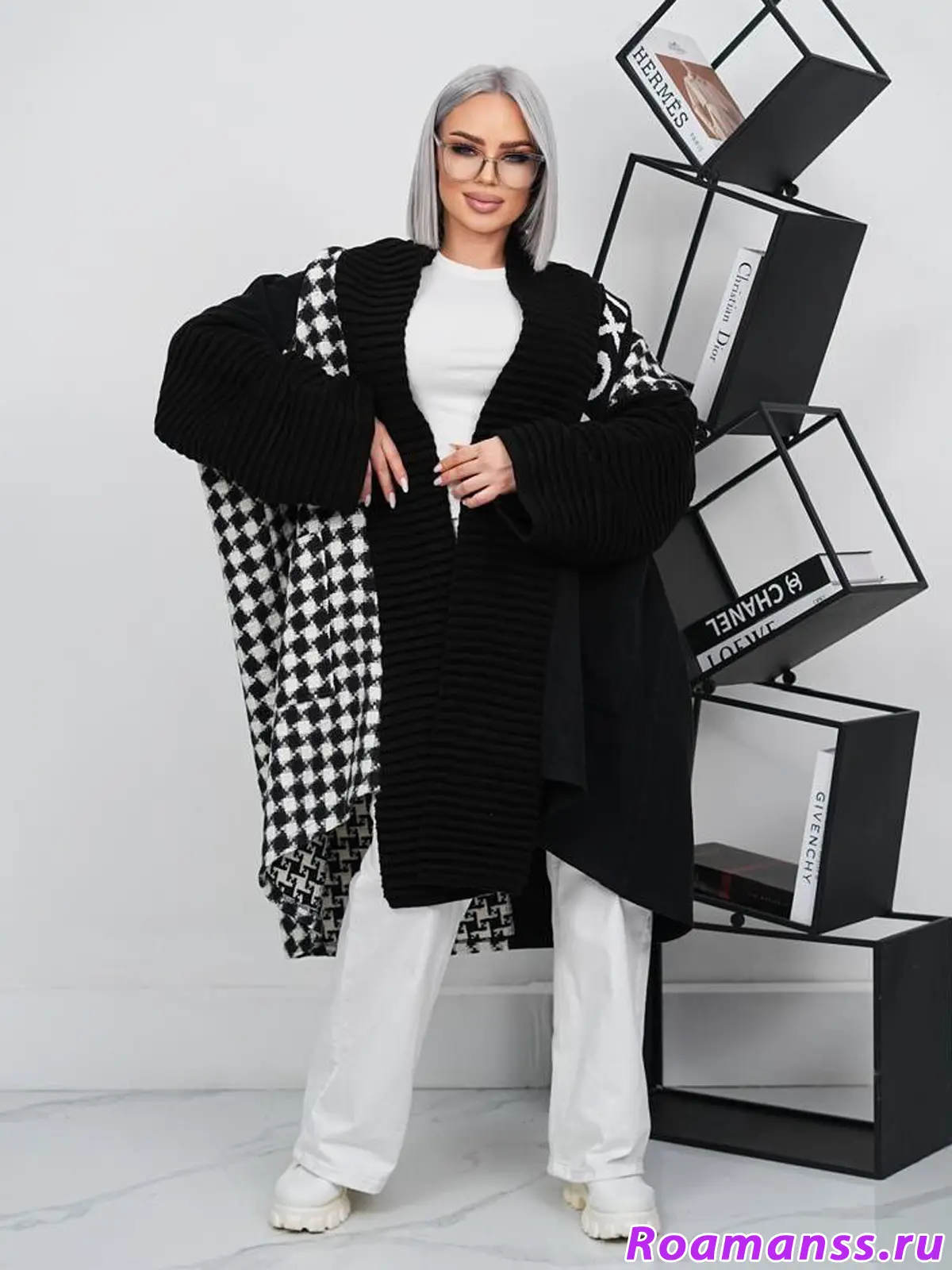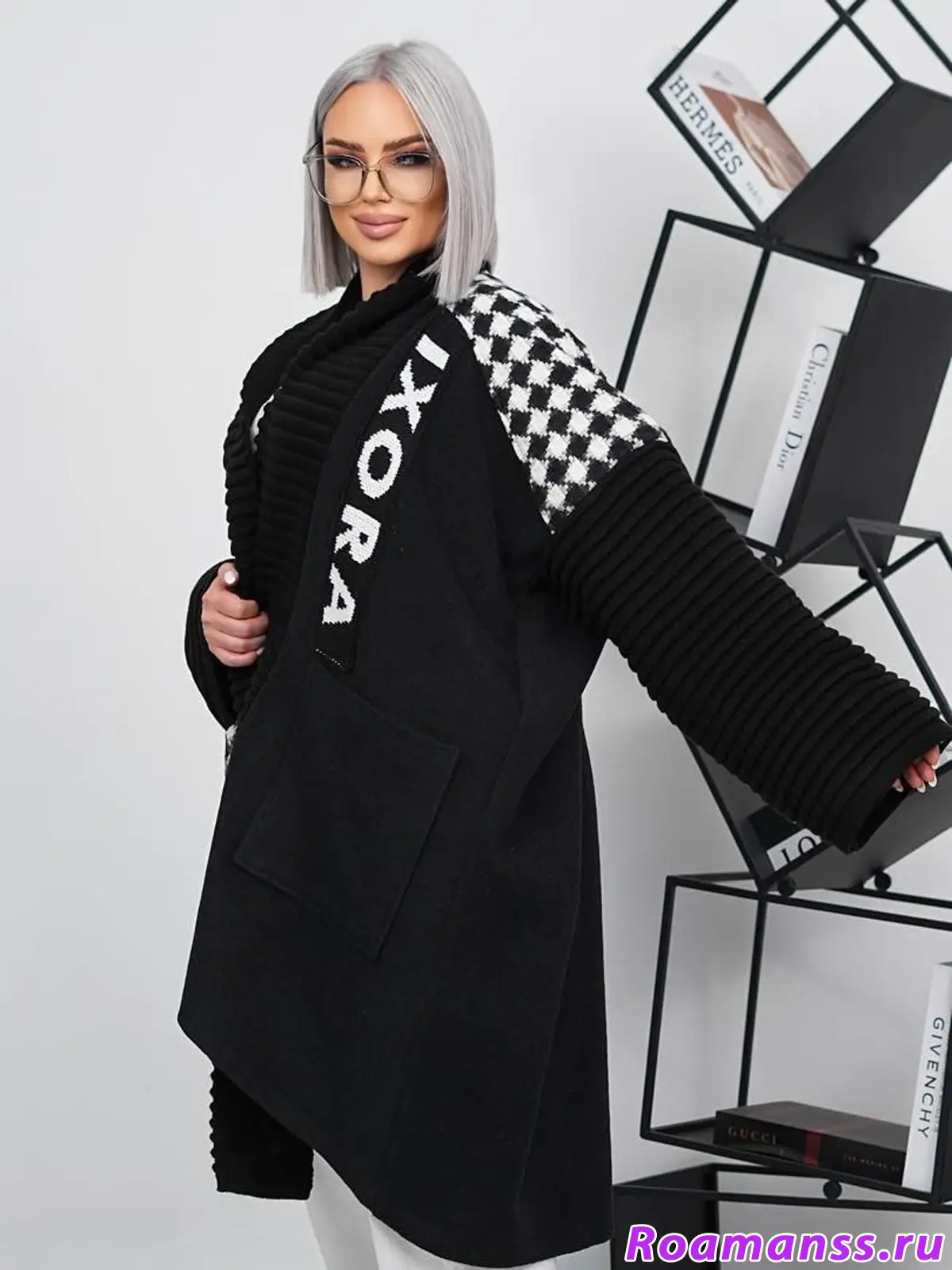 Очень модный и стильный кардиган из двух видов ткани: пальтовой и плотного вязаного трикотажа. Фасон свободный. Спереди накладные карманы. Премиальная фактура, эффектный крой, роскошный объём —на фигуре он выглядит просто космос. Длина 103см.