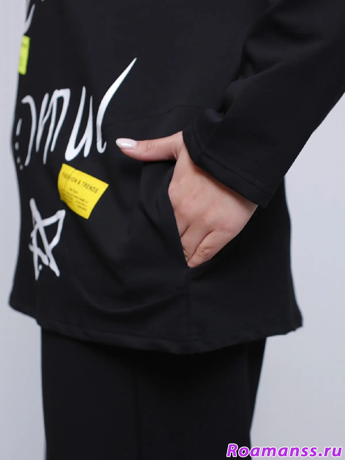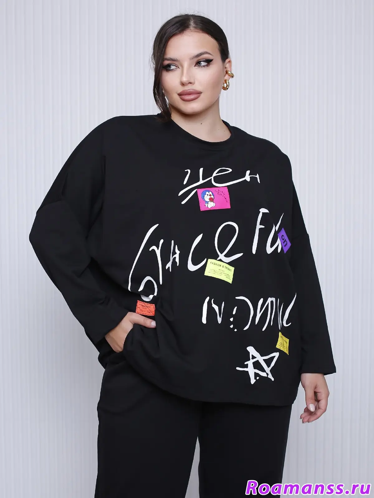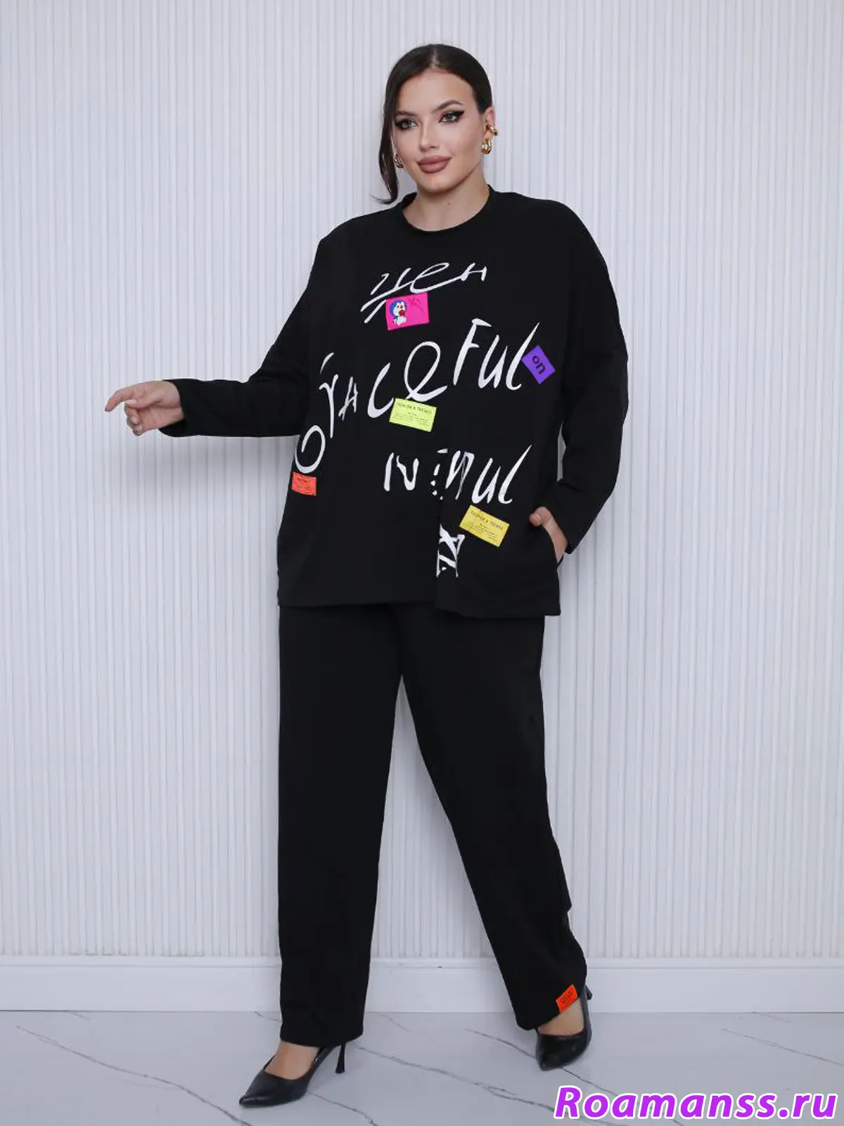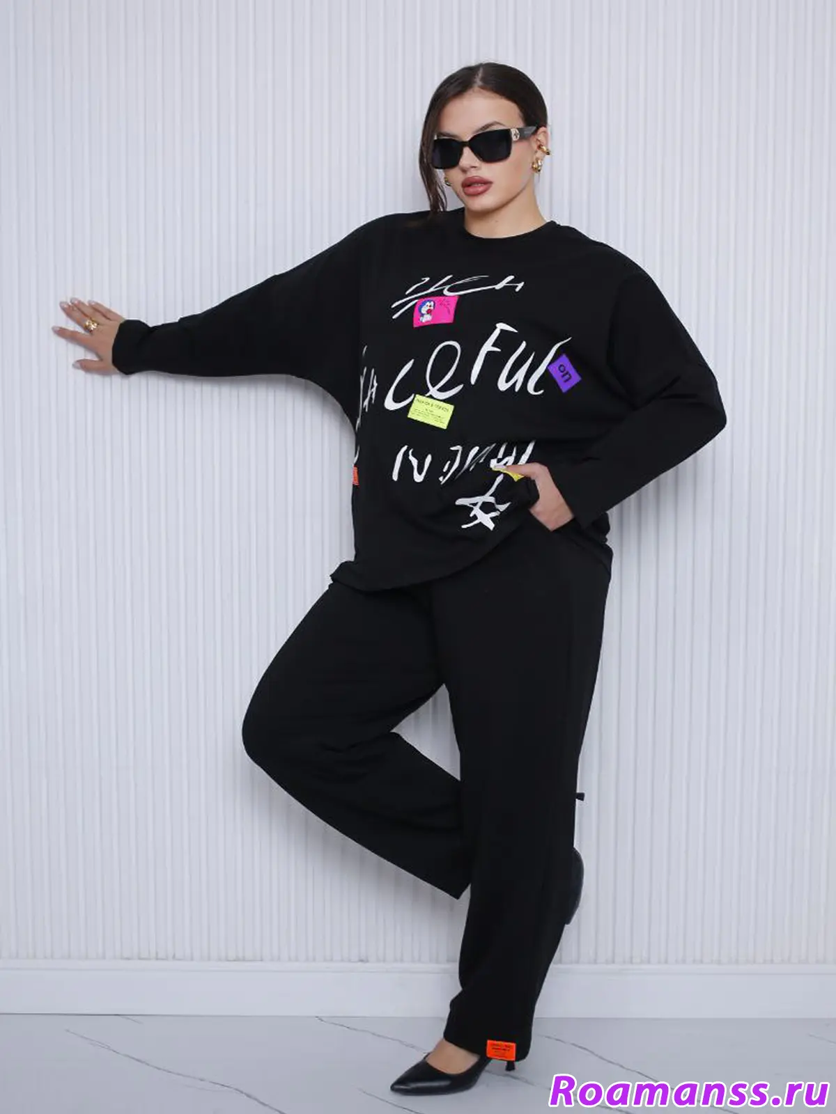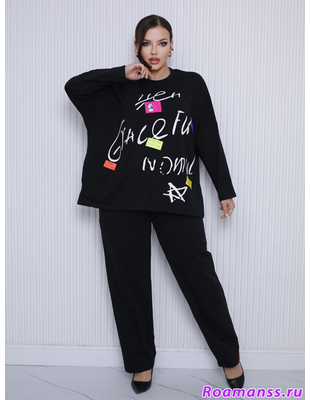 Молодёжный трикотажный костюм с премиальной шелкографией — выглядит дорого и эффектно, идеально смотрится на полной фигуре. Состоит из свитшота и брюк. Свитшот свободного прямого кроя. Линия плеча приспущена. Боковые карманы во швах. Длина 77см. Брюки спортивного прямого кроя с поясом на резинке. Спереди под поясом карманы. Длина 112см.