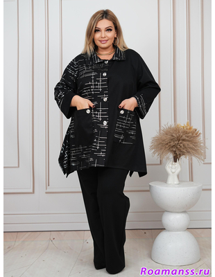 Эффектная туника-рубашка. Выполнена из приятной ткани канада. Канада - ткань средней плотности(похожа на трикотаж двухнитку) слегка тянется. Фасон расклешен. Украшена серебристым принтом. Застёгивается на пуговицы. Спереди накладные карманы. Длина 86см.
