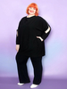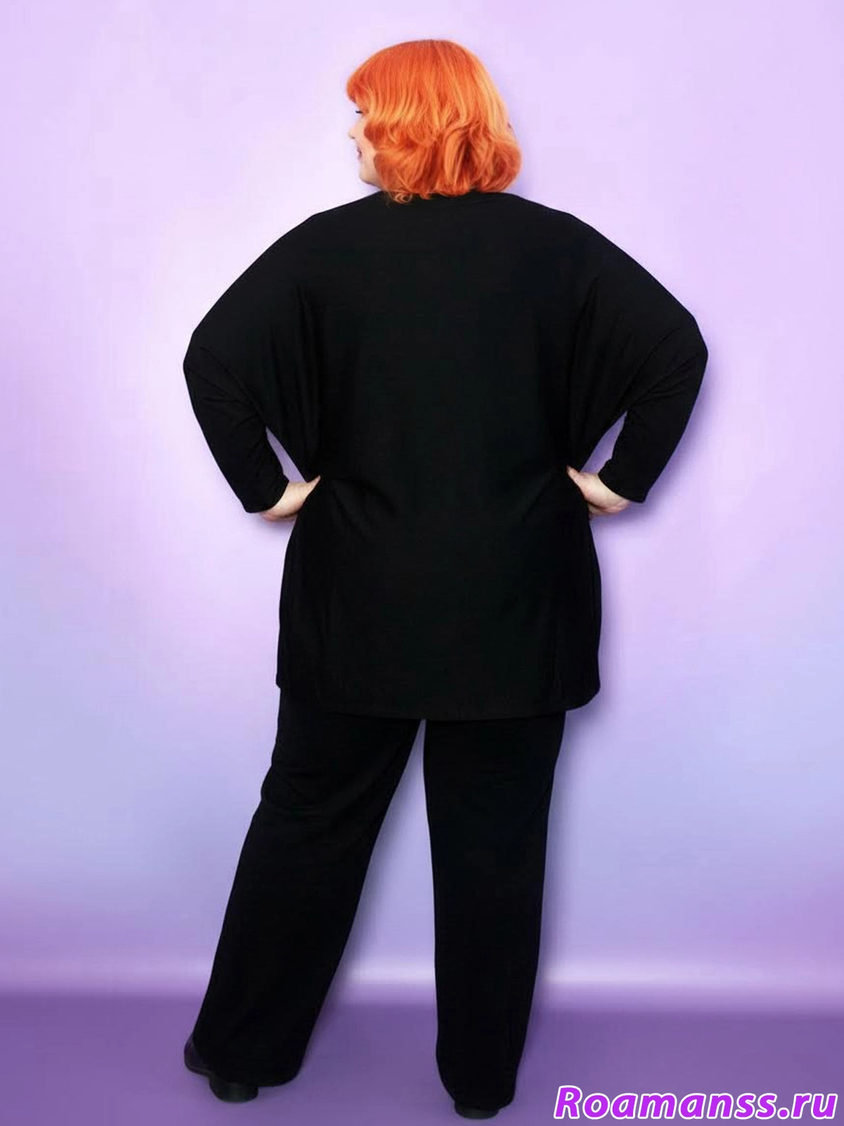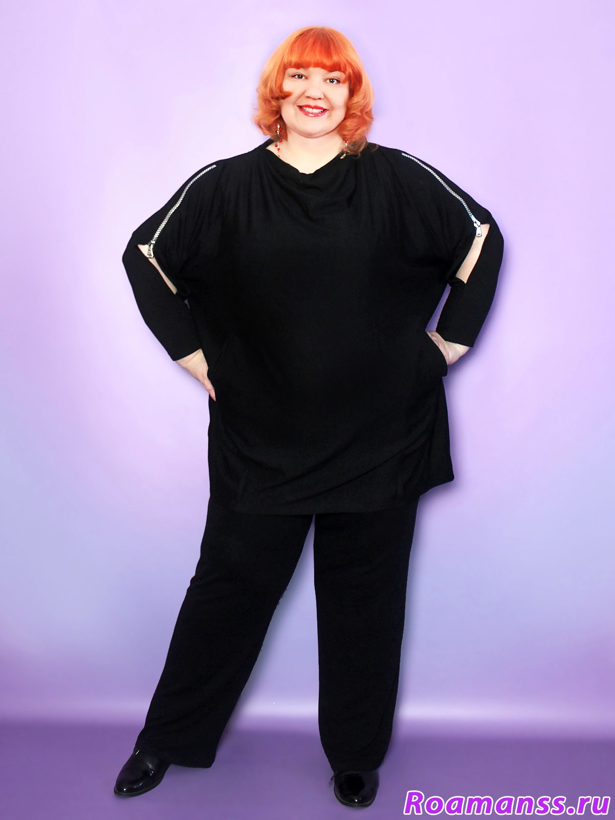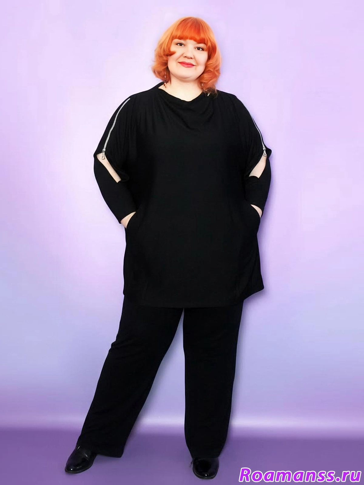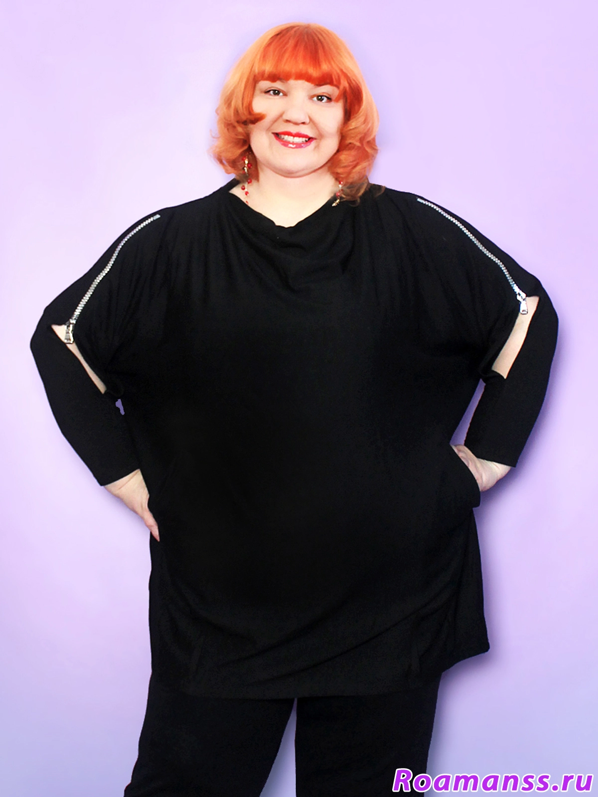 Стильная туника из мягкого утепленного трикотажа. Фасон прямой. Рукава формы летучки. Рукава украшены декоративными молниями. Вырез горловины типа шалька. Спереди прорезные карманы. Длина 87см.