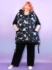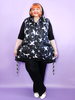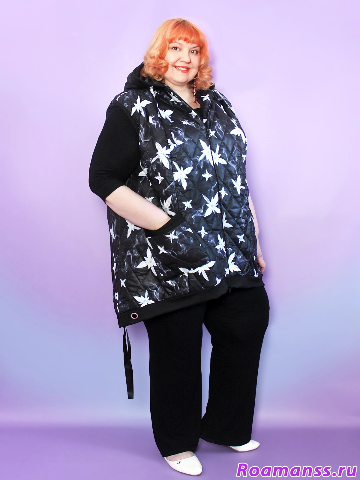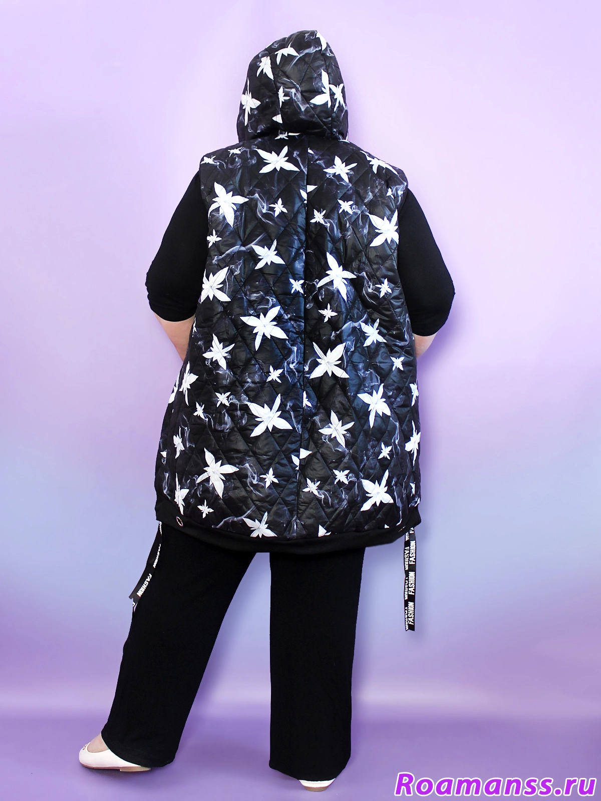 Стёганый жилет с капюшоном большого размера. Фасон расклешен. Застёгивается на молнию. Спереди накладные карманы. По низу украшен тесьмой и люверсами. Жилет на подкладке и тонком утеплителе синтепон. Длина спереди 90см, по спинке 100см. Промеры