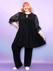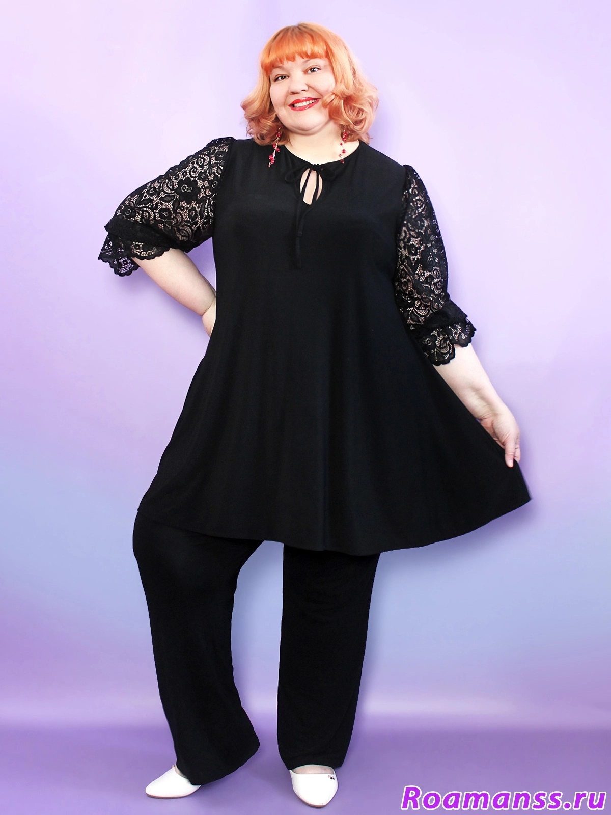 Женственная туника больших размеров из мягкого корейского трикотажа с рукавами из гипюра. Свободный А-силуэт туники маскирует полноту в районе живота и бёдер. Вырез горловины украшен капелькой с бантиком. Рукава-фонарики присборены резинкой и формируют нежную рюшу по низу. Длина 96см подходит на любой рост. Универсальный черный цвет, который стройнит, гармонично сочетается со всеми аксессуарами и отлично подходит для любого случая от праздника до офиса.