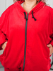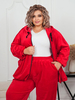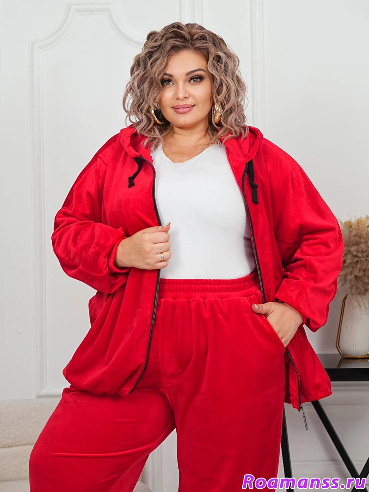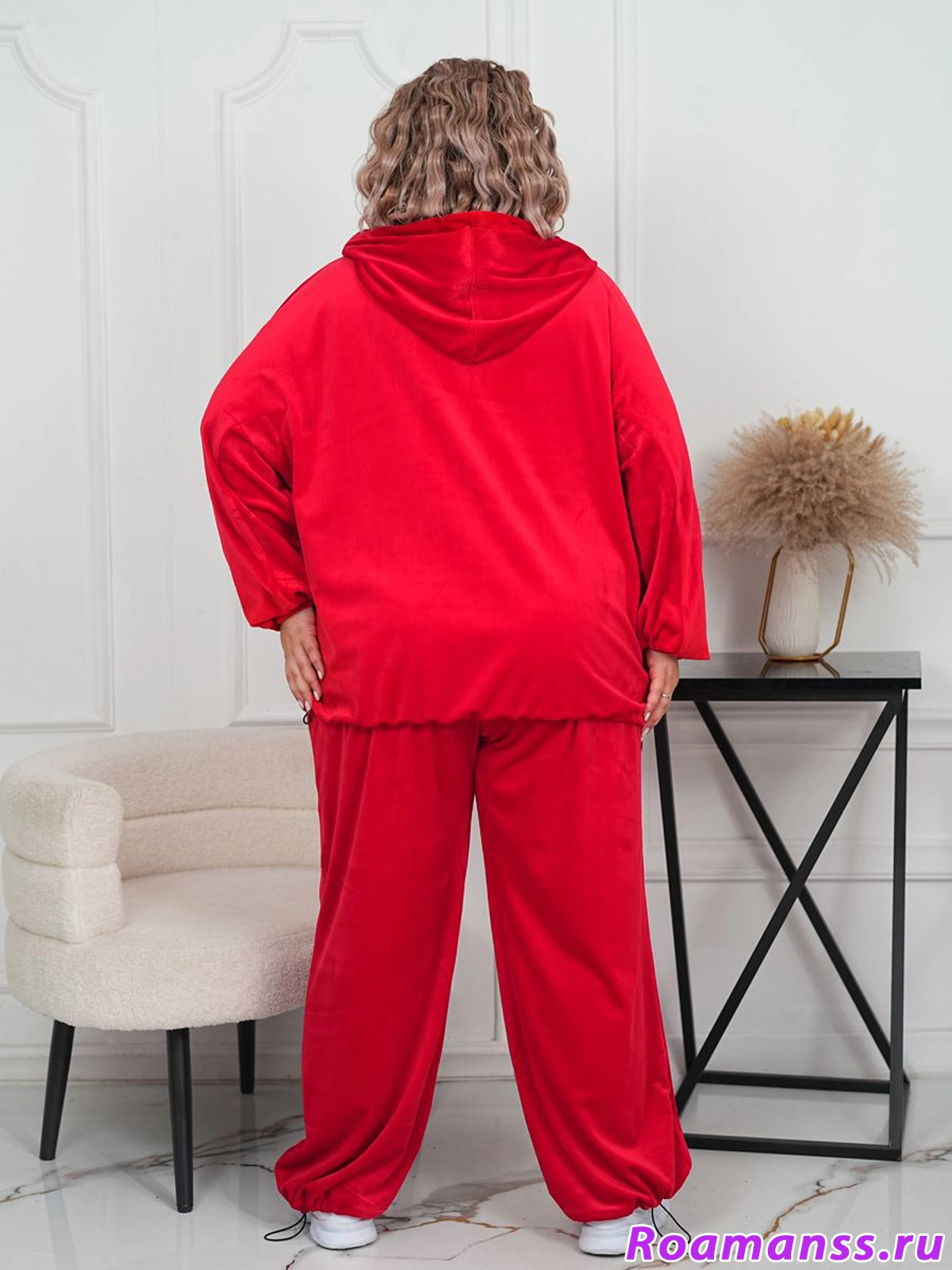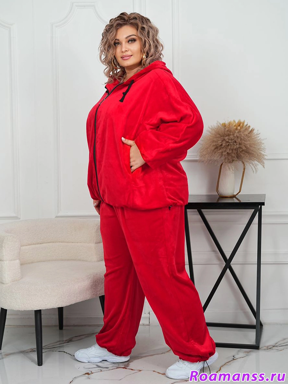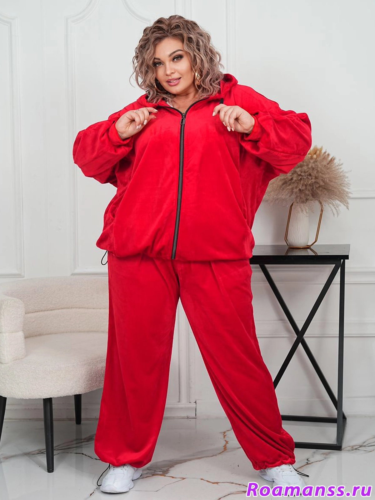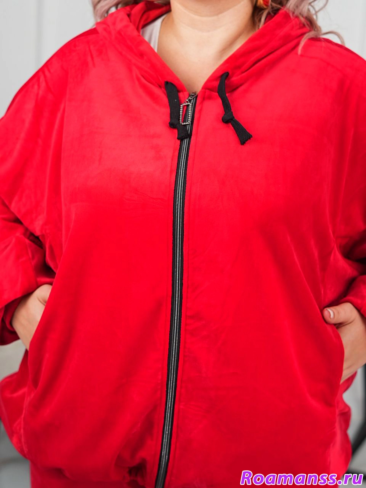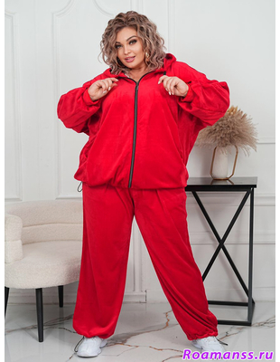 Шикарный велюровый костюм большого размера. Выполнен из качественного плотного велюра на хлопковой основе. Состоит из олимпийки с капюшоном и брюк. Олимпийка застёгивается на молнию. По низу кулиска регулирует ширину. Свободные рукава. Длина 76см. Брюки с поясом на резинке. Спереди под поясом карманы. Длина 110см. Эффектный костюм для роскошных дам.
