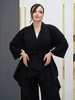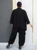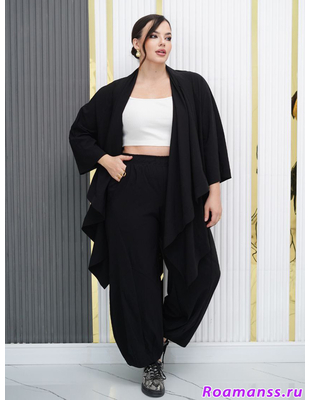 Лёгкий костюм для весны-лето из ткани на хлопковой основе бенгалин. Костюм состоит из кардигана и брюк. Кардиган свободного оригинального кроя, низ с перепадом длины. Рукава формы реглан. Брюки типа шароварчиков свободные к низу заужены. Пояс круговая резинка. Спереди под поясом карманы. Сзади накладные карманы. Длина кардигана спереди в центре 107см, по спинке 75см. Длина брюк 100см. Пояс входит в комплект.